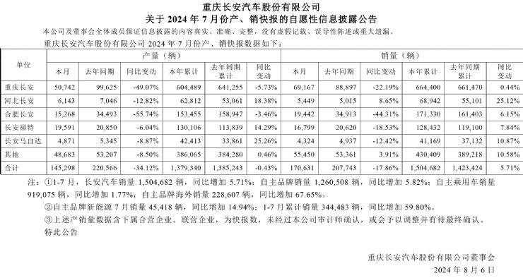 2024年1-7月,长安汽车累计销量已经超过150万辆,达到1504682辆,同比增长5.71%。其中,自主品牌累计销量1260508辆,同比增长5.82%;自主品牌乘用车销量919,075辆,同比增长1.77%;自主品牌海外累计销量228,607辆,同比增长67.65%。