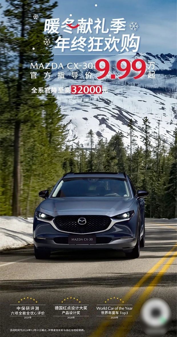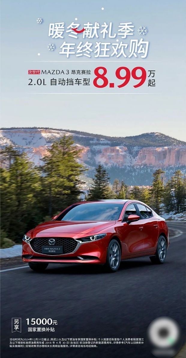 马自达CX-30全系官降至高3.2万元,售价9.99万起;马自达3 昂克赛拉2.0L自动挡车型可享限时售价8.99万起(2.0L自动挡车型指导价格为9.99万起),另外可享受国家置换补贴1.5万元。