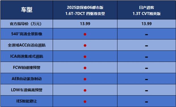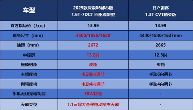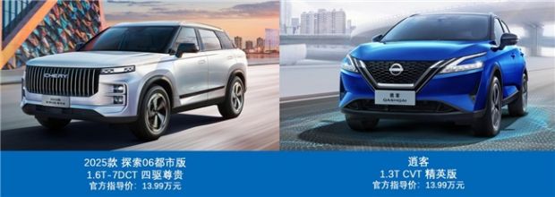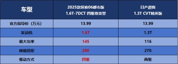2025探索06所在的细分领域,有不少实力强劲的车型,比如东风日产逍客,很多人在买车时都会纠结两款车应该怎么选。今天我们拿官方指导价均为13.99万的2025款探索06都市版四驱尊贵型和日产逍客精英版进行详细对比,看看究竟谁才是真正“MVP”。