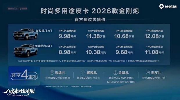 10月22日,2026款长城金刚炮正式登场,为皮卡市场注入新活力。此次新车推出多个版本,价格门槛亲民,其中金刚炮6MT车型官方建议零售价8.98万元起,8AT车型则从9.98万元起售,满足不同消费者预算需求。?